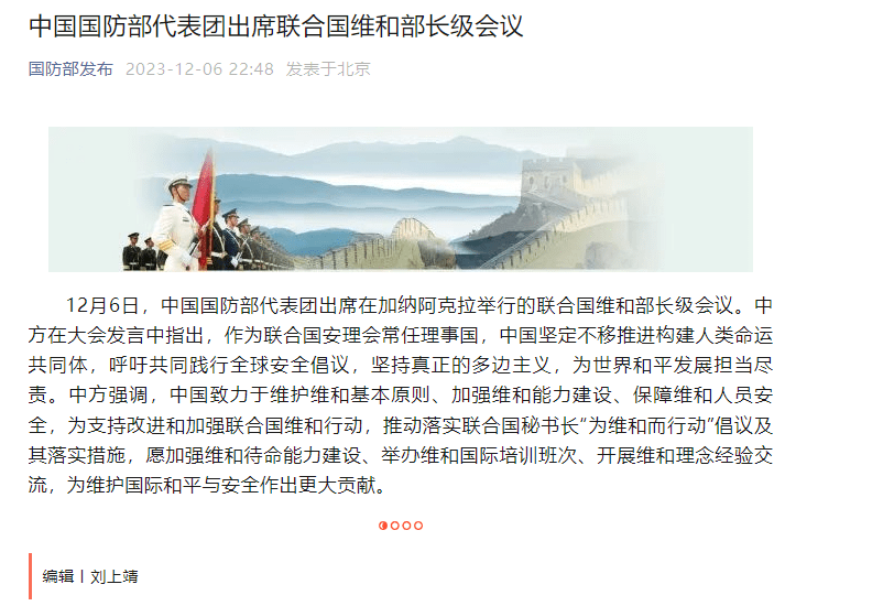 12月6日,中国国防部代表团出席在加纳阿克拉举行的联合国维和部长级会议。中方在大会发言中指出,作为联合国安理会常任理事国,中国坚定不移推进构建人类命运共同体,呼吁共同践行全球安全倡议,坚持真正的多边主义,为世界和平发展担当尽责。中方强调,中国致力于维护维和基本原则、加强维和能力建设、保障维和人员安全,为支持改进和加强联合国维和行动,推动落实联合国秘书长“为维和而行动”倡议及其落实措施,愿加强维和待命能力建设、举办维和国际培训班次、开展维和理念经验交流,为维护国际和平与安全作出更大贡献。