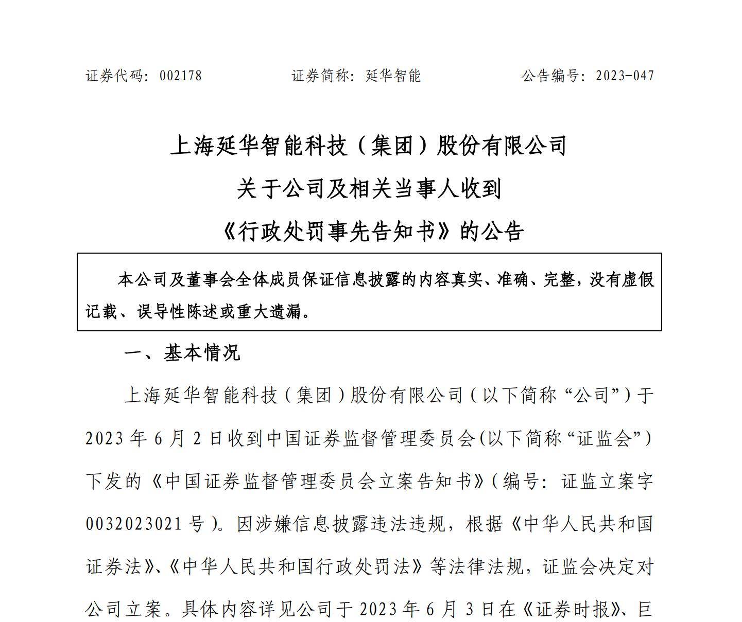 2023年12月5日晚间,上海延华智能科技(集团)股份有限公司(简称公司或者延华智能)公告称,公司及相关当事人收到中国证券监督管理委员会上海监管局出具的《行政处罚事先告知书》。
