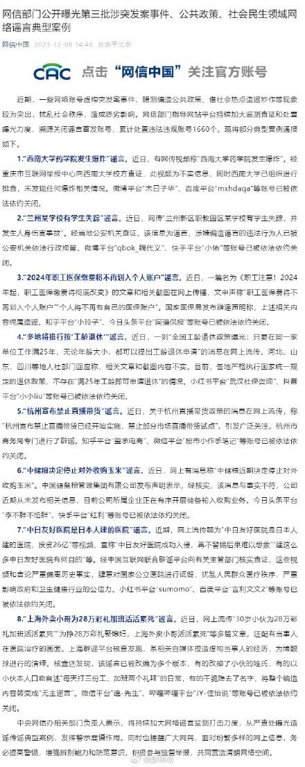 近期,一些网络账号虚构突发案事件、臆测编造公共政策、借社会热点造谣炒作等现象较为突出,扰乱社会秩序,造成恶劣影响。网信部门指导网站平台持续加大监测查证和处置曝光力度,溯源关闭谣言首发账号,累计处置违法违规账号1660个。现将部分典型案例通报如下(网信中国)