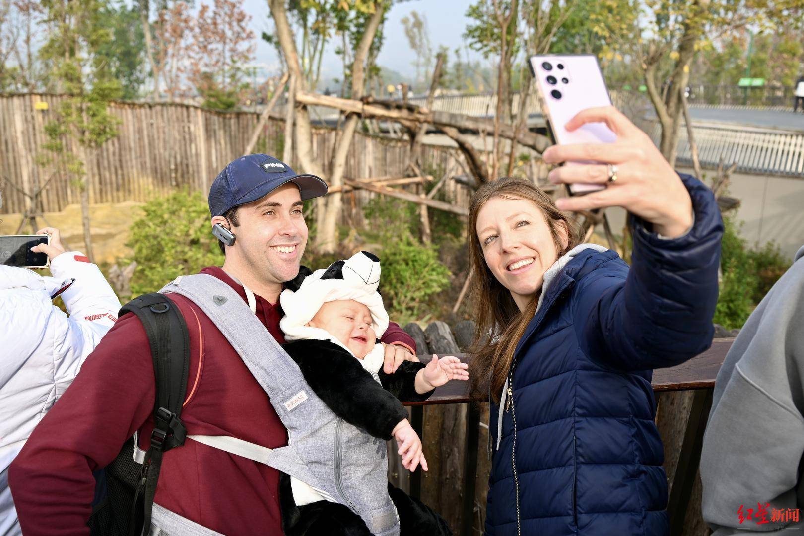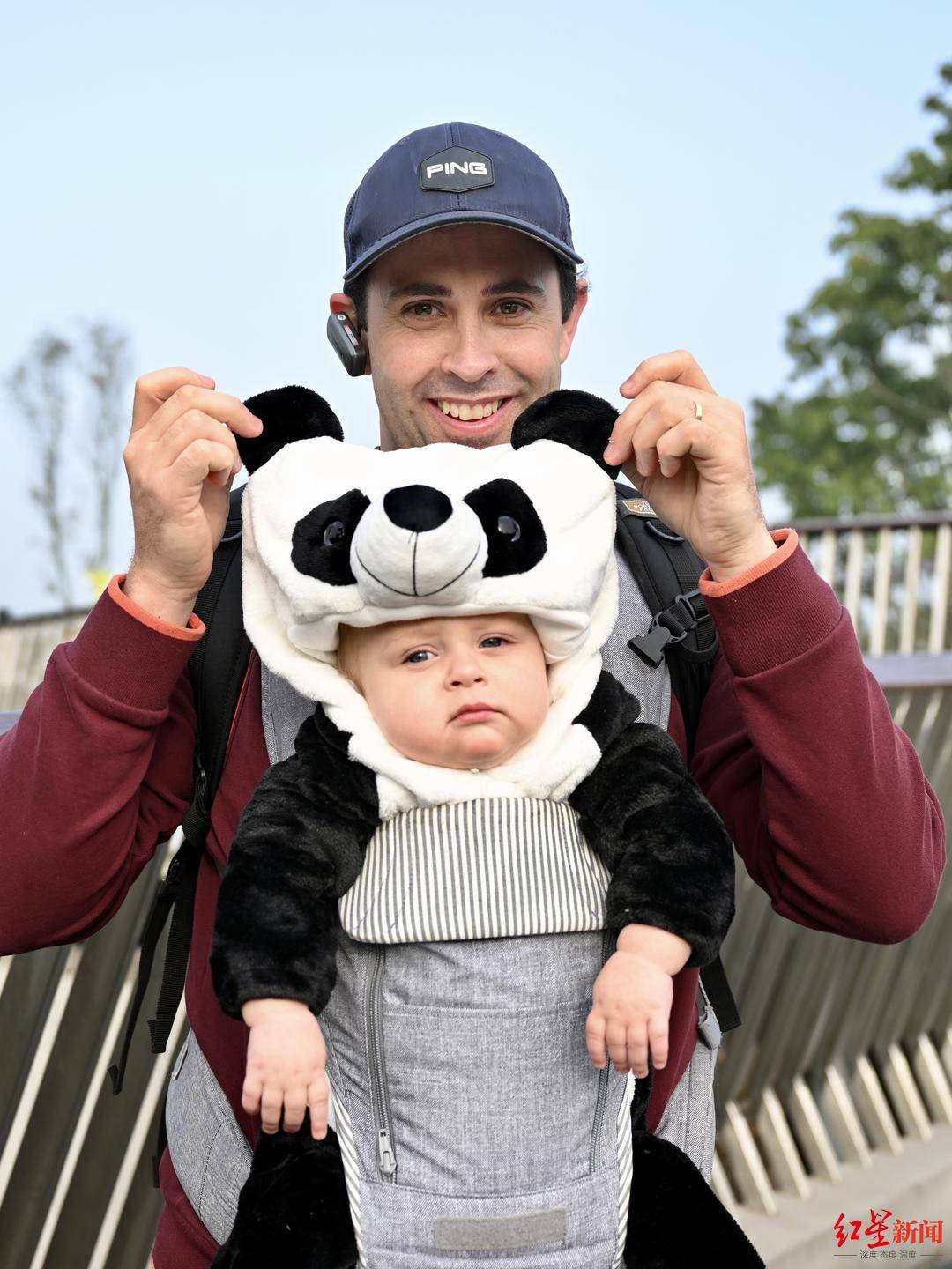 澳大利亚队运动员布罗姆利·米歇尔的丈夫带着“熊猫宝宝”一起参观