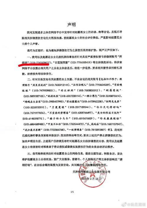 据该网友发布的图片,今年2月28日,天津银河酷娱文化传媒有限公司以及赵露思女士,已委托律师事务所针对具有严重侵权情节的多个微博账号主体提起诉讼,要求相关被告承担赔礼道歉、赔偿损失等法律责任,被起诉的微博账号中就包括此次发帖者。