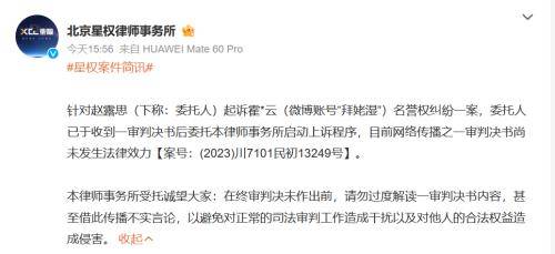 对此,受赵露思方委托的律师事务所回应称,已启动上诉程序,目前网络传播之一审判决书尚未发生法律效力。