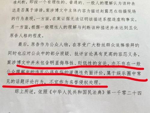 该网友此次发布的判决书显示,“原告作为公众人物,在享受广大粉丝群众追捧崇拜的同时,也应当对公众中的部分质疑、批评言论具有更高的容忍义务。案涉博文中并未包含明显侮辱性、贬低性的言论,亦不存在一般大众理解中的违反公序良然的道德性负面评价,属于娱乐圈中常见的话题评论行为,不宜作为名誉侵权处理。”
