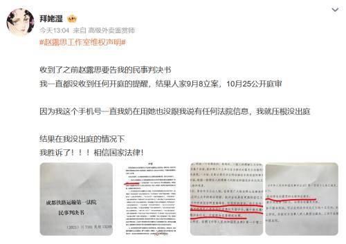12月6日,有微博用户发文称,自己收到被赵露思方起诉的民事判决书。该网友称:收到了之前赵露思要告我的民事判决书。因为我这个手机号一直我奶在用,她也没跟我说有任何法院信息,我就没出庭。结果我胜诉了!相信国家法律!