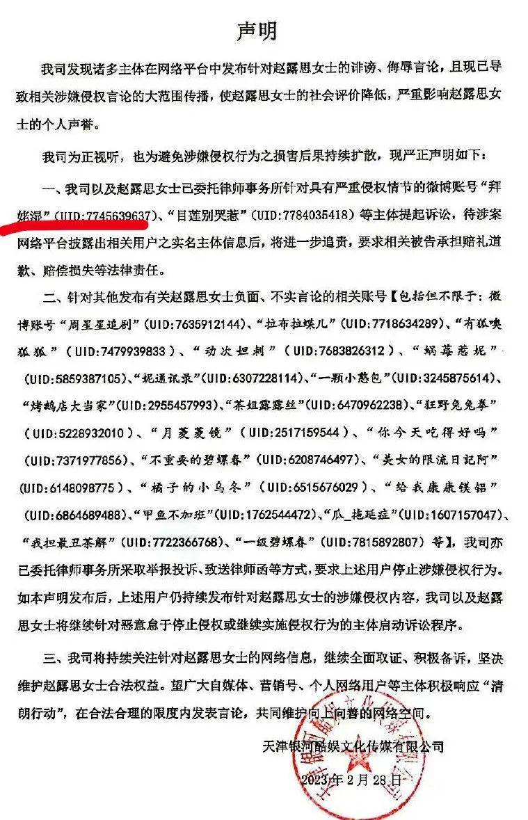 该网友晒出的图片显示:天津银河酷娱文化传媒有限公司以及赵露思女士,于2023年2月28日委托律师事务所针对具有严重侵权情节的多个微博账号主体提起诉讼,赵露思方起诉该网友具有严重侵权行为。