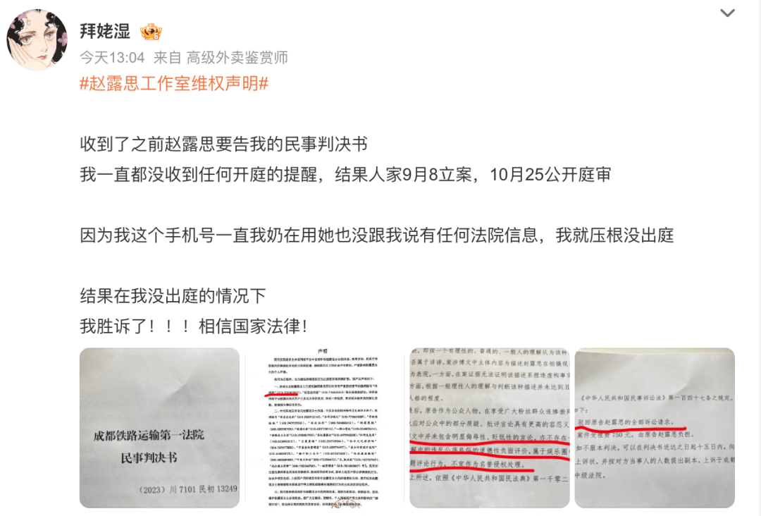 6日,有网友晒出赵露思起诉自己的民事判决书,并发文称:“终于收到了之前赵露思要告我的民事判决书。因为我这个手机号一直我奶在用,她也没跟我说有任何法院信息,我就没出庭。结果我胜诉了!相信国家法律!”