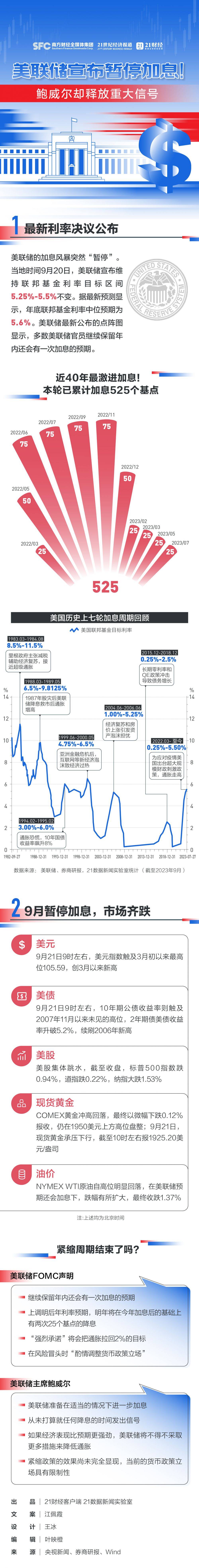 鹰派暂停!北京时间周四凌晨2点,美联储发布9月联邦公开市场委员会声明,以及今年第三份经济预期。用一句话来总结,虽然美联储没动政策利率,但通过经济预期给出了今年还有可能加息,以及明年降息预期减少的信息。美国历史上七轮加息周期,本轮加息已高达525个BP,近40年来最激烈!美联储9月宣布暂停加息后,各类资产怎么变化?鲍威尔释放了什么信号?21数据新闻实验室与你一图搞懂!