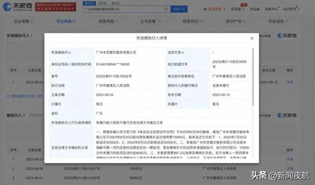 生效法律文书确定的义务显示,原被告确认双方签订的《单店自主经营合作合同》于2023年6月29日解除,被告广州本宫餐饮服务有限公司于2023年8月25日前分两次向原告黄某某返还使用费7万元,若未按时足额返还任一期款项,原告可向法院申请强制执行7万元中未履行的款项及违约金8000元。案件流程信息显示,此前,该公司已因该案被强制执行7.8万元并被限制高消费。