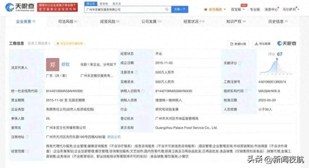 据了解,广州本宫餐饮服务有限公司成立于2015年11月,法定代表人为郑权,注册资本500万元人民币。