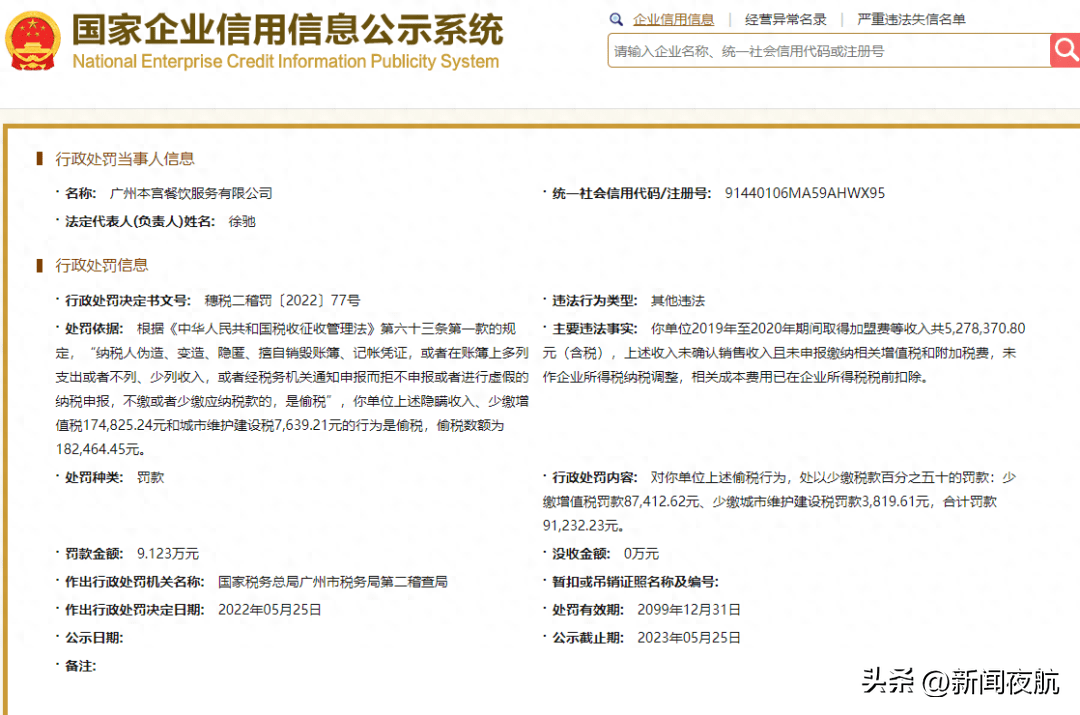 行政处罚决定书显示,本宫餐饮2019年至2020年期间取得加盟费等收入共5278370.80元(含税),上述收入未确认销售收入且未申报缴纳相关增值税和附加税费,未作企业所得税纳税调整,相关成本费用已在企业所得税税前扣除。