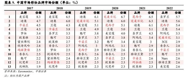 根据中银证券的相关研报,2020年前,彩妆头部品牌以国际品牌为主,美宝莲持续位于市占率第一。随着文化自信的增强和国潮风的掀起,彩妆国货品牌凭借其产品品质的提升以及相对于海外龙头彩妆品牌的价格优势,逐年扩大市场份额。