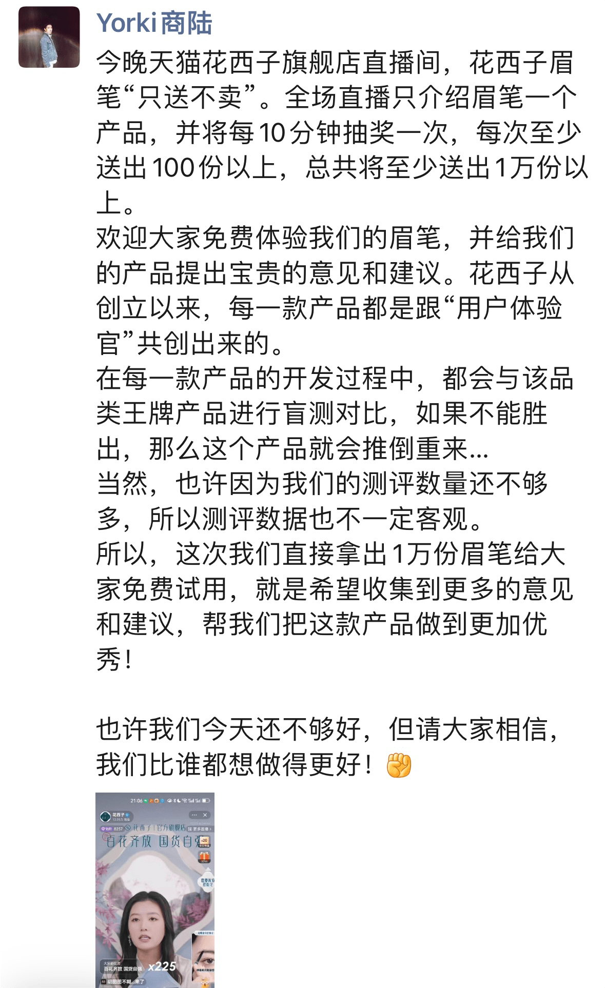 “欢迎大家免费体验我们的眉笔,并给我们的产品提出宝贵的意见和建议。”花满天在朋友圈表示。