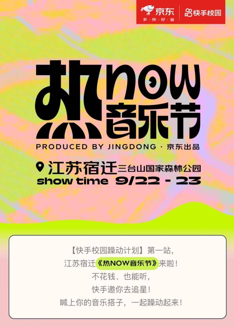 9月22日-23日,快手校园躁动计划第一站——京东热NOW音乐节重磅来袭,快手校园为同学们提供了两种免费获取门票的方式:音乐教父罗大佑、摇滚先锋二手玫瑰、金曲天后蔡健雅、回春丹乐队、民谣歌手马頔、鹿先森乐队等十余组潮流音乐人将在现场演唱,与大学生一同相约初秋、共赴热NOW。