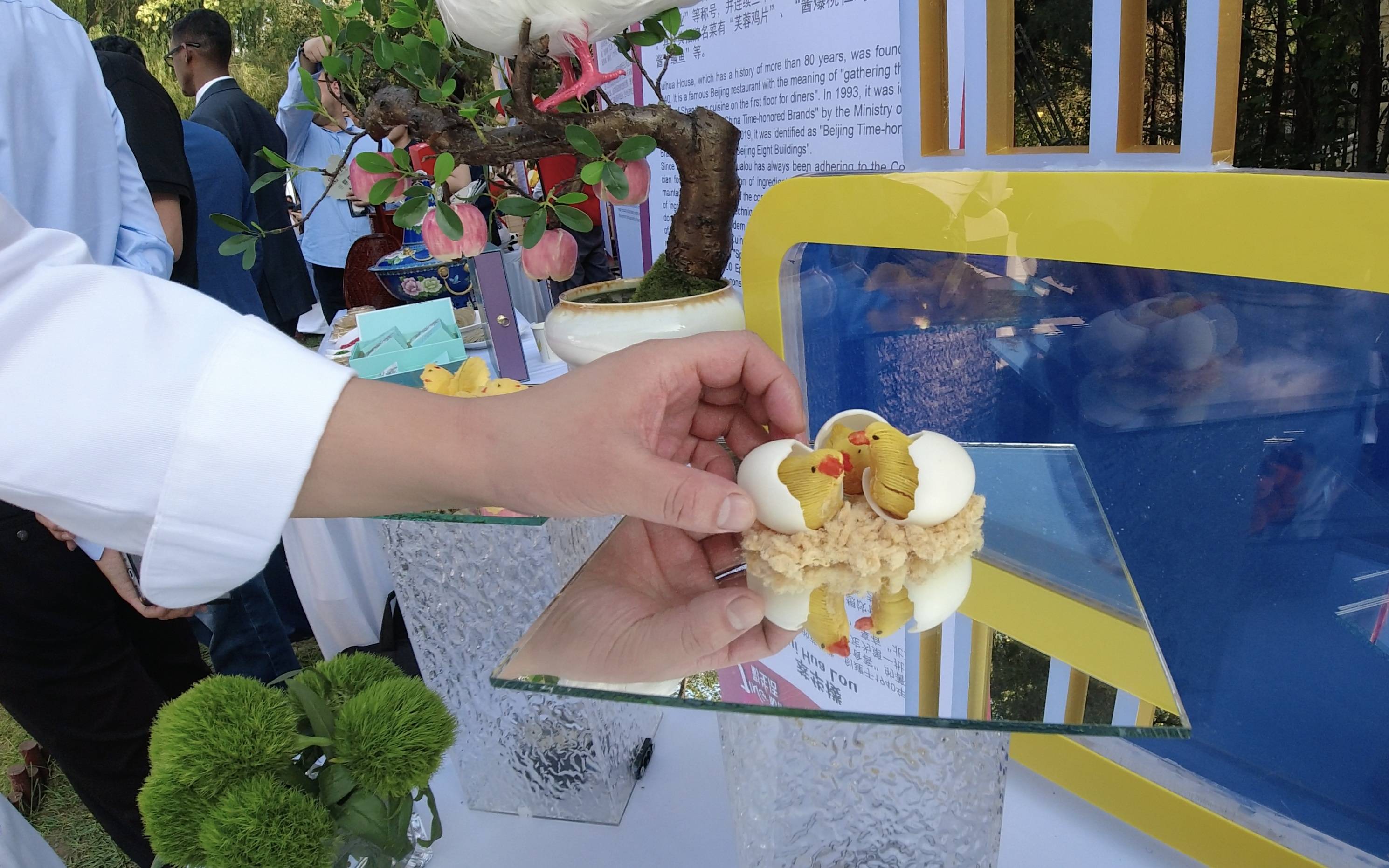 为了契合一带一路国际美食长廊文化交流会和国际和平日主题,萃华楼在展示区域呈现了相关造型的面点。面点师傅纯手工制作的苹果树、柿子和和平鸽,寓意平安如意、和平。萃华楼行政总厨刘红星重点向新京报记者推荐了一道“繁衍生息”小鸡酥,这道中式点心融入了独特创意,特点是有三层味道,外面的蛋壳食材采用白色巧克力,里面的小鸡则为手工制成的酥皮,小鸡酥内又包含莲蓉的馅料。