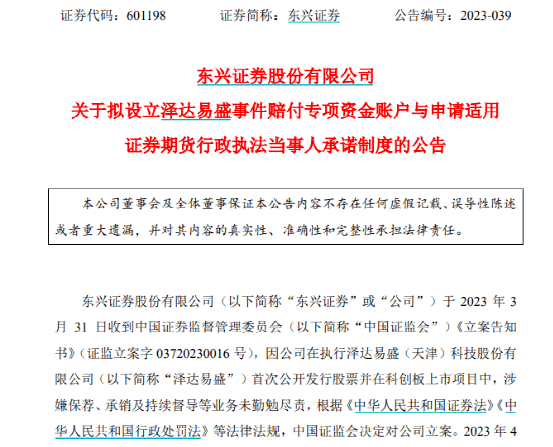 据东兴证券介绍,为保护投资者合法利益,维护证券市场稳定,其于2023年9月21召开董事会会议,审议通过《关于拟设立泽达易盛事件赔付专项资金账户与申请适用证券期货行政执法当事人承诺制度的议案》。