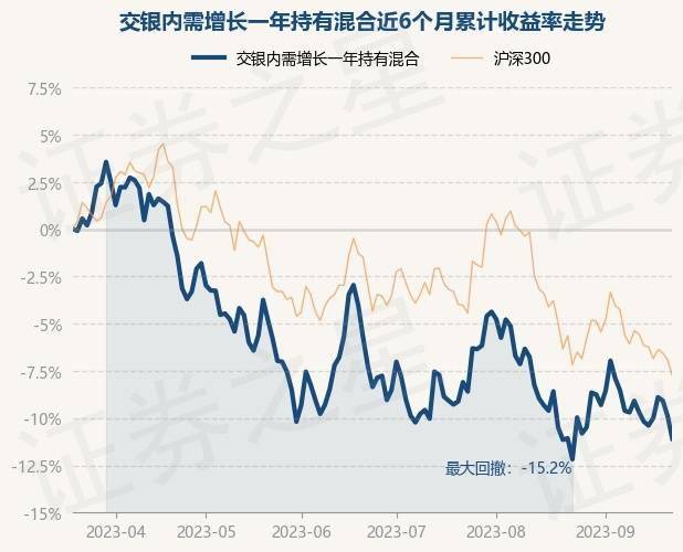 9月21日,交银内需增长一年持有混合最新单位净值为0.8103元,累计净值为0.8103元,较前一交易日下跌1.34%。历史数据显示该基金近1个月上涨0.05%,近3个月下跌4.14%,近6个月下跌11.03%,近1年下跌0.95%。该基金近6个月的累计收益率走势如下图: