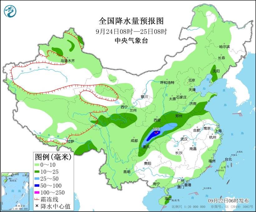 9月24日08时至25日08时,青海南部、甘肃南部、陕西南部、四川东部、重庆、湖北西部和北部、河南、山东南部等地部分地区有中到大雨,其中,四川东北部、重庆北部等地局地有暴雨或大暴雨(100~120毫米)(见图3)。