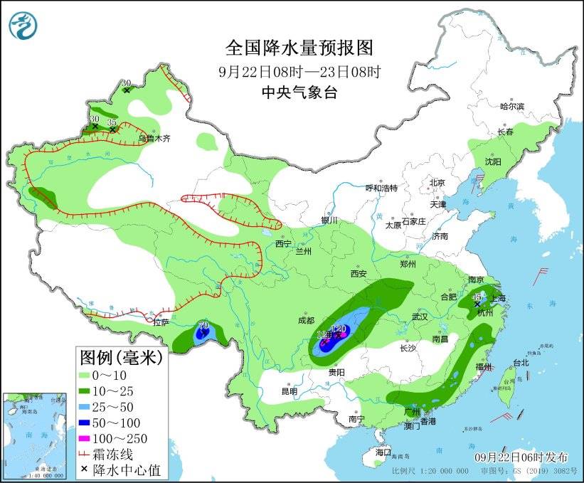 9月22日08时至23日08时,新疆伊犁河谷、西藏东南部、四川盆地东部、重庆、贵州中北部、湖北西部、江苏南部、上海、浙江、福建、广东中东部等地部分地区有中到大雨,其中,西藏东南部、四川东南部、重庆南部、贵州北部等地局地有暴雨或大暴雨(100~120毫米)(见图1)。