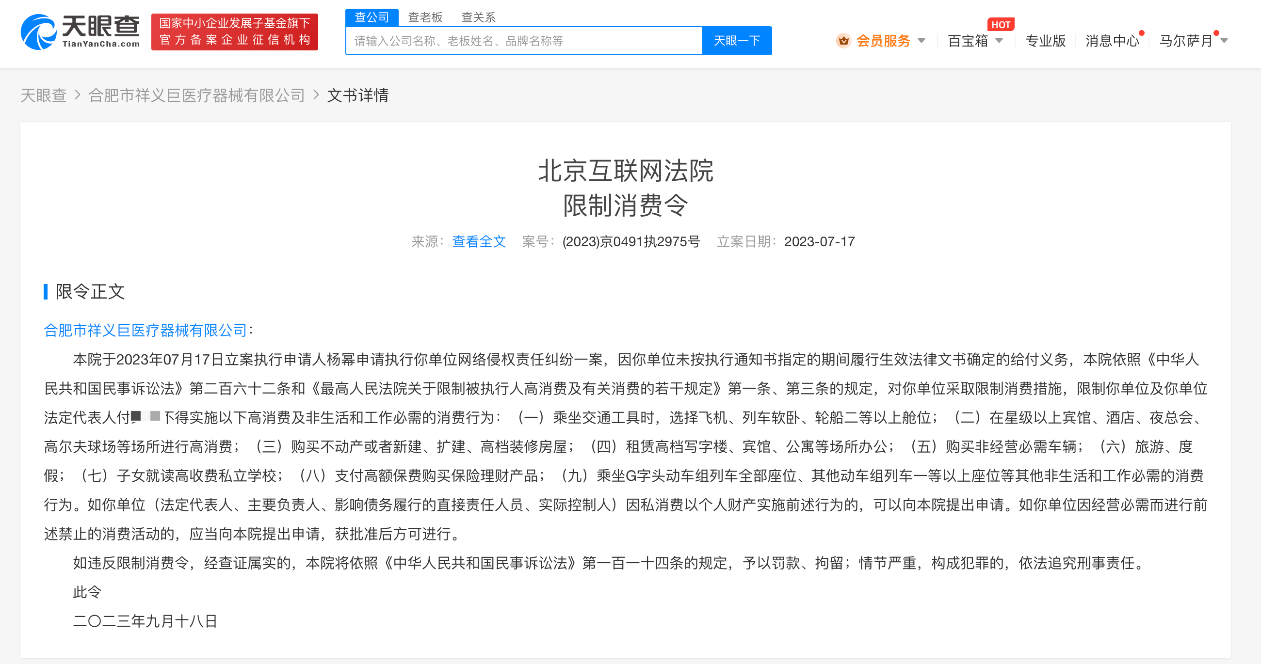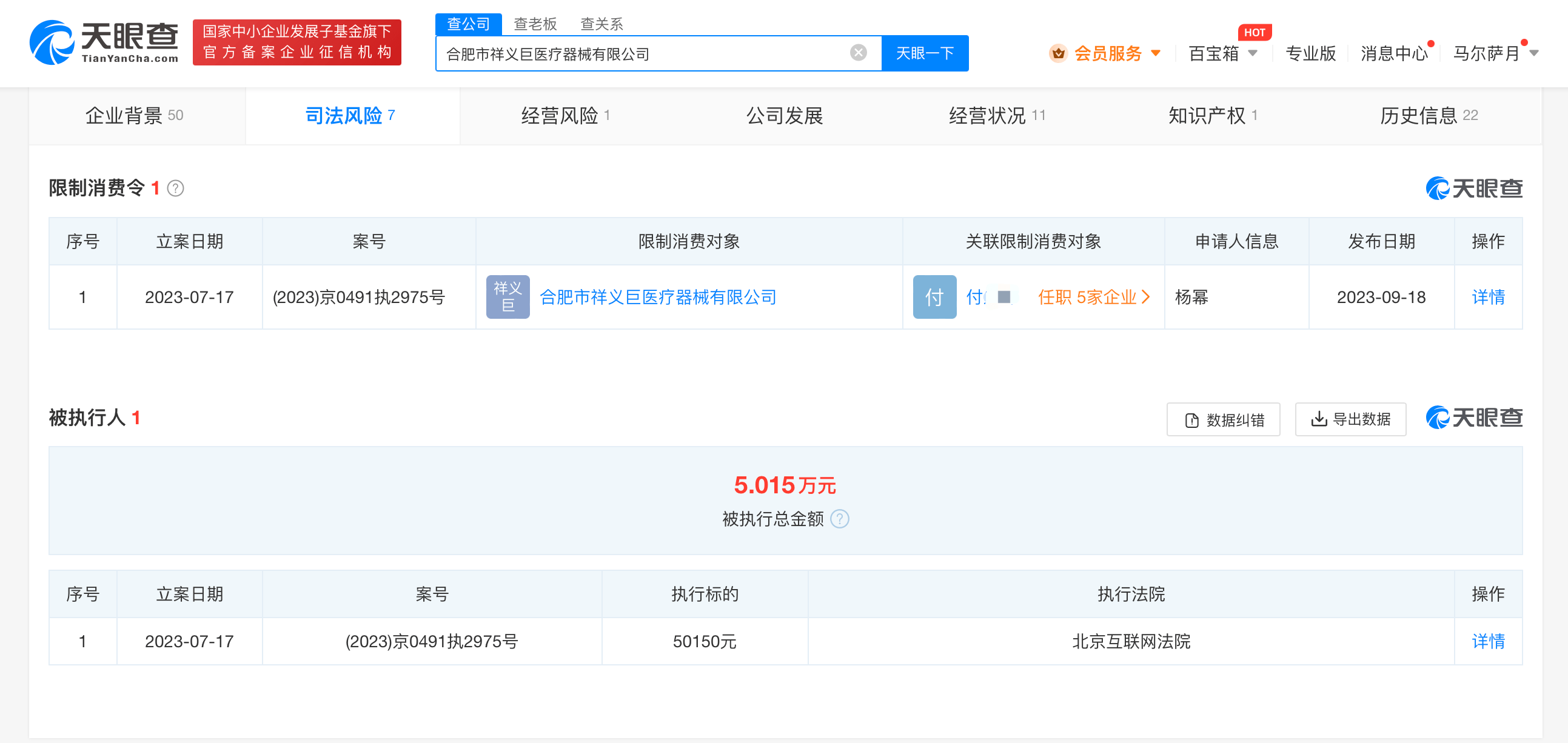 天眼查App显示,近日,合肥市祥义巨医疗器械有限公司及法定代表人付某某新增一则限制消费令,涉及杨幂与该公司网络侵权责任纠纷案件。相关判决文书显示,该公司未经原告杨幂同意,在网店中使用杨幂肖像并标注“杨幂”“携手助力”等字样,售卖医用口罩等商品,法院认定该公司侵犯杨幂肖像权、姓名权,判决其刊登声明向杨幂致歉,并赔偿杨幂经济损失5万元。案件流程显示,今年7月,该公司被强制执行。