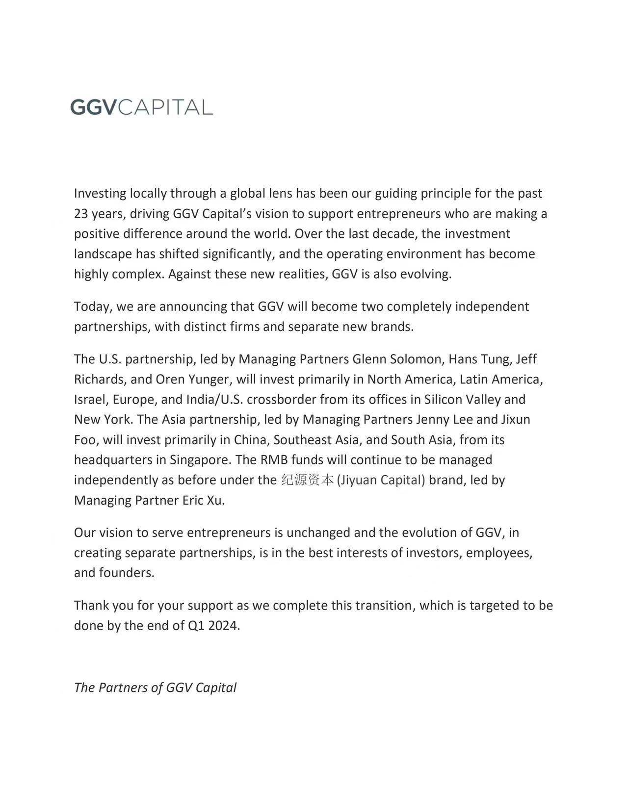 纪源资本此前的母公司GGV也通过社交媒体发布声明称,GGV分拆为美国和亚洲两个机构,预计将于2024年第一季度末完成独立。