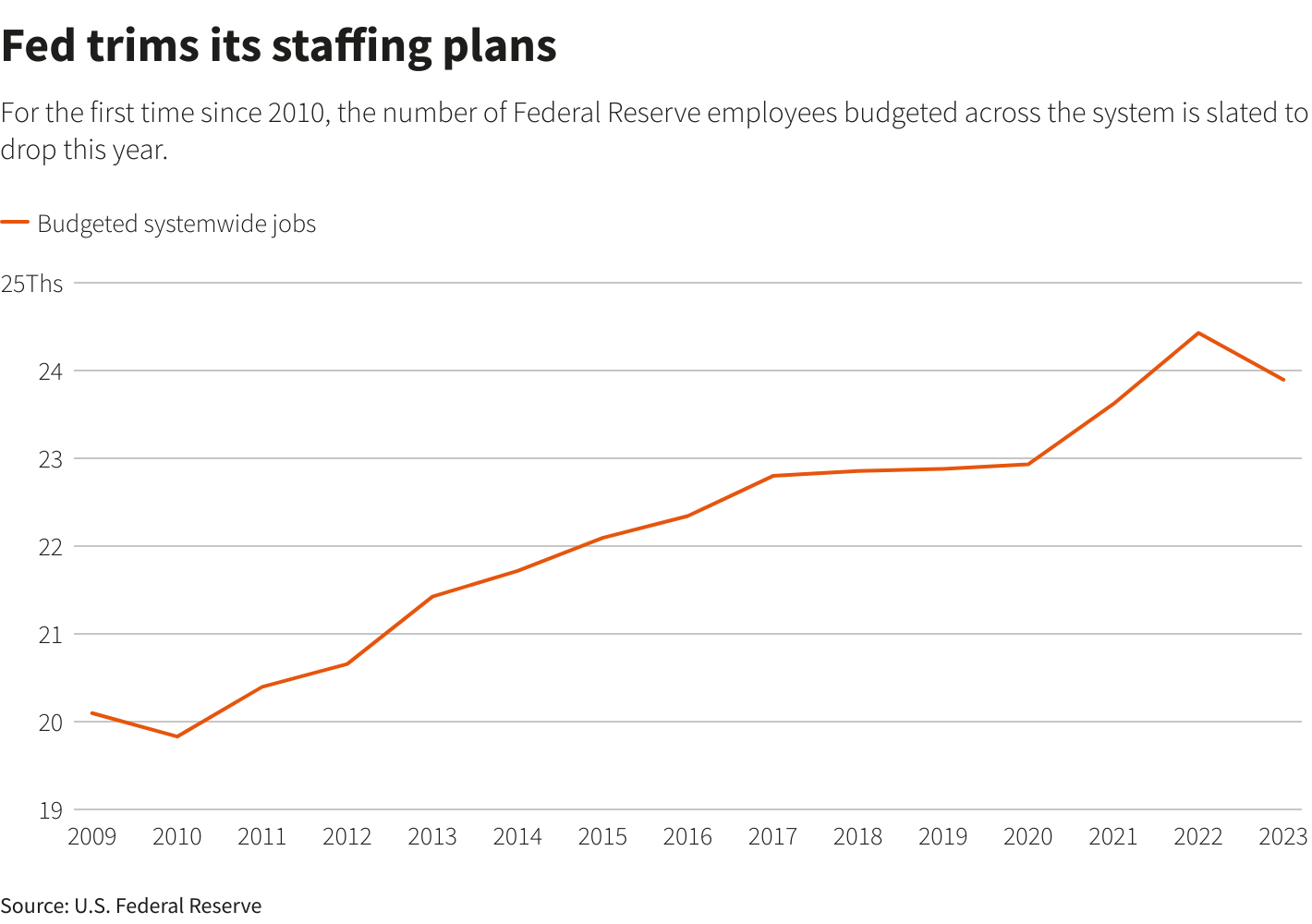 虽然这比起美联储总体的员工规模小得多,但这是其自2010年以来首次缩减编制内员工数量。