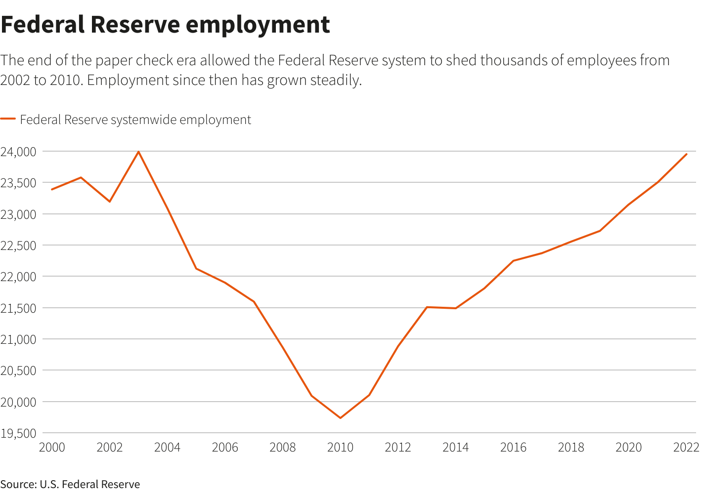 本世纪初,美联储全系统的工作岗位数量一直在下降,从2003年的不到24000个降至2010年的19735个。因为纸质支票时代的结束,美联储得以削减清理和处理这些文件所需的大量工人。
