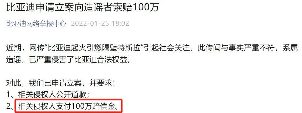 对此,比亚迪已申请立案,并要求相关侵权人公开道歉,并支付100万元赔偿金。