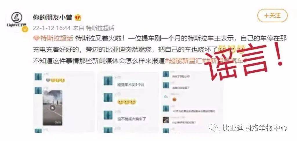 2022年1月,比亚迪发文称,近期网传“比亚迪起火引燃隔壁特斯拉”引起社会关注。此传闻与事实严重不符,系属造谣,已严重侵害了比亚迪合法权益。