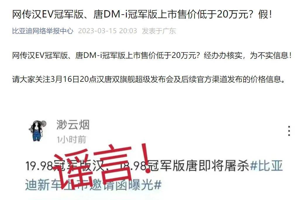就在今年3月份,比亚迪网络举报中心发文称,网传汉EV冠军版、唐DM-i冠军版上市售价低于20万元?经办办核实,为不实信息!