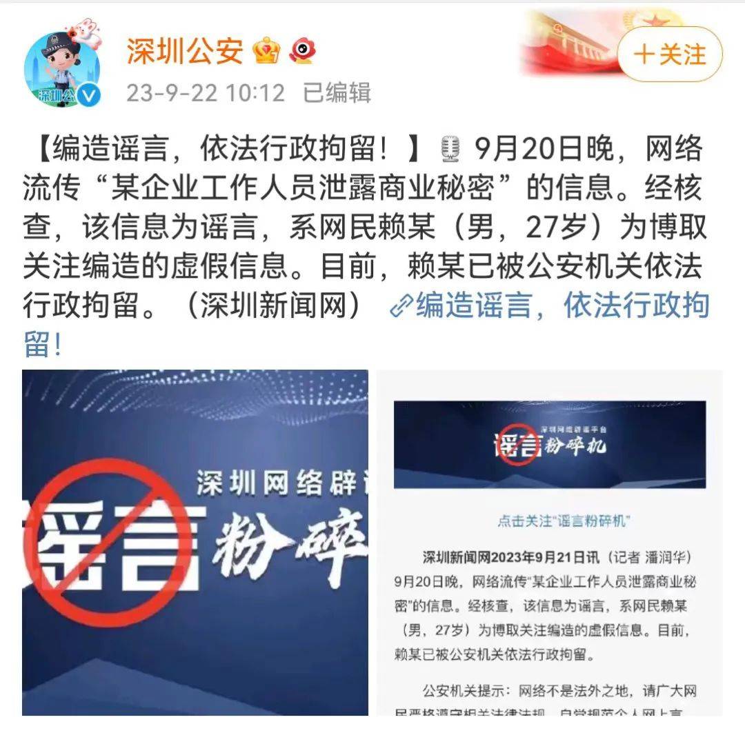 9月22日上午,针对上述事项,深圳公安发布微博动态称:“编造谣言,依法行政拘留!”