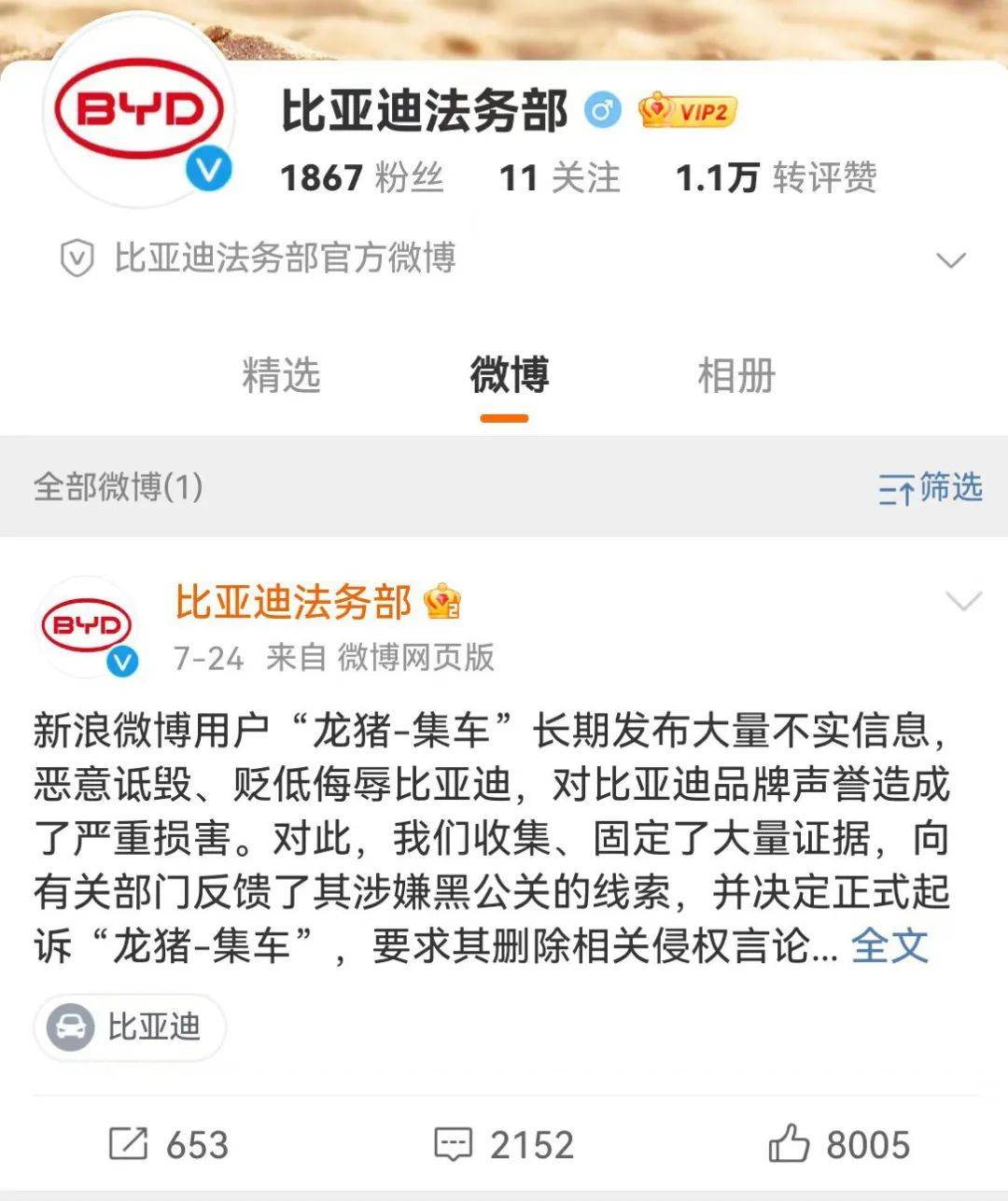 7月24日,比亚迪法务部微博发布首条动态:新浪微博用户“龙猪-集车”长期发布大量不实信息,恶意诋毁、贬低侮辱比亚迪,对比亚迪品牌声誉造成严重损害。