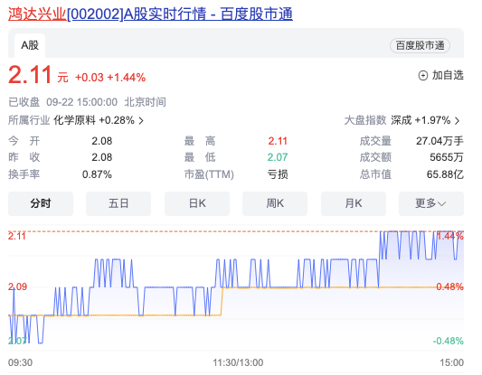 二级市场上,截至9月22日收盘,鸿达兴业涨1.44%,报2.11元/股。