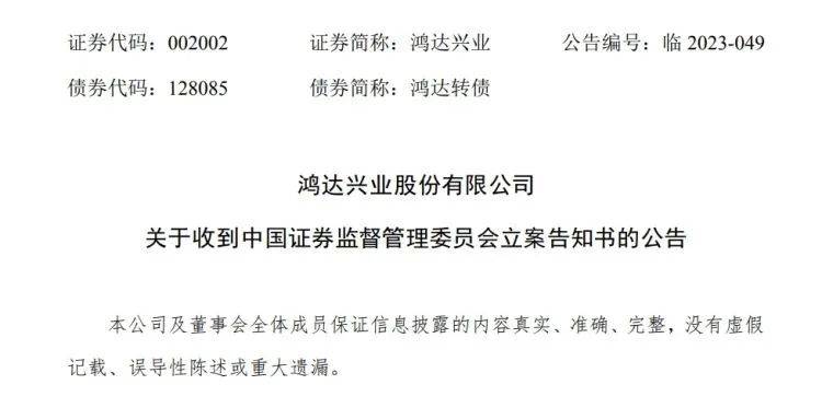 鸿达兴业(002002)9月22日晚间公告,公司今日收到中国证券监督管理委员会下发的《立案告知书》。因鸿达兴业涉嫌信息披露违法违规,根据《中华人民共和国证券法》《中华人民共和国行政处罚法》等法律法规,2023年9月14日,中国证监会决定对公司立案。