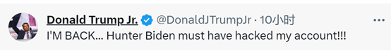 美国前总统特朗普的长子小特朗普当地时间22日在社交平台X(原推特)上发文称,“我回来了……亨特·拜登肯定黑了我的账号!!!”他指的是美国总统拜登的小儿子亨特。