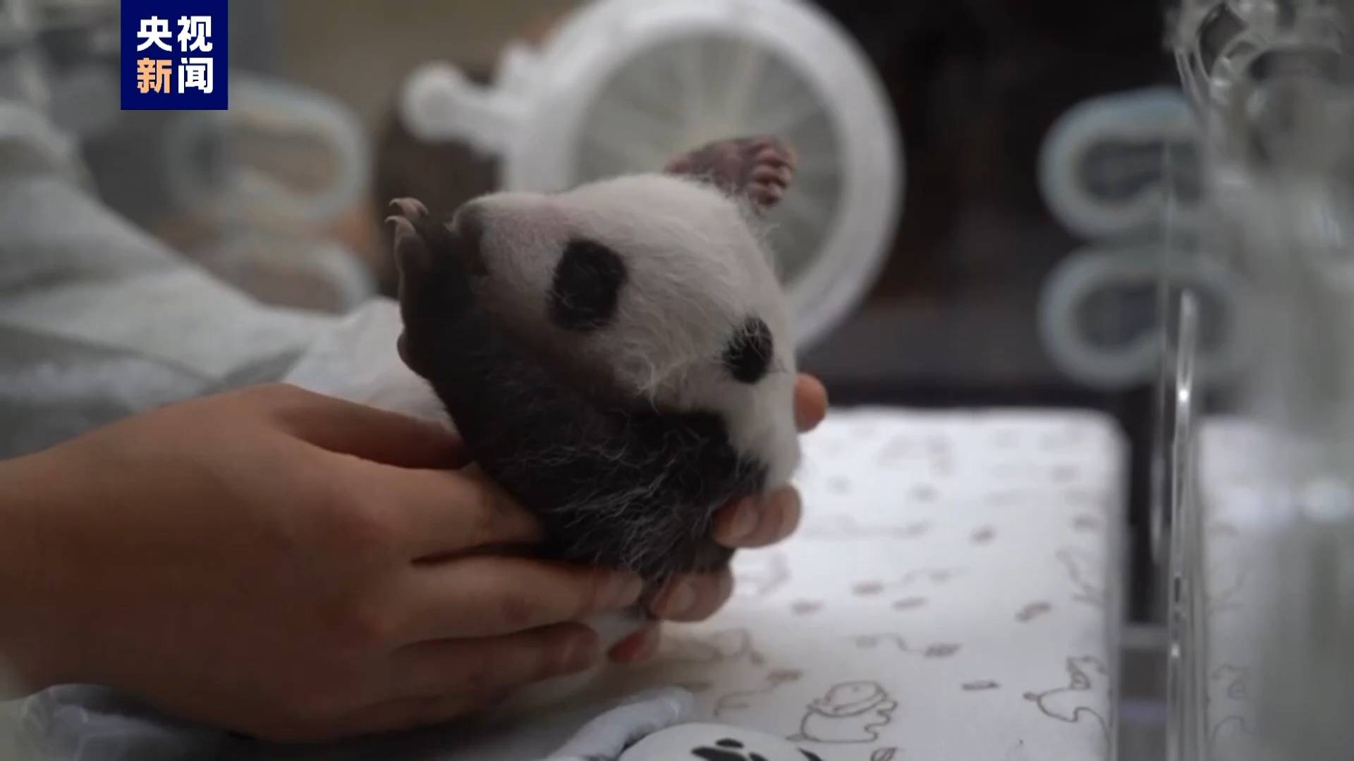 幼崽被抱走时,“丁丁”吃到了最美味的竹子。幼崽被迅速转移到保温箱中,“丁丁”的反应很平静。专家们尽快对幼崽进行了检查。现在幼崽的体长为36.8厘米,体重为1288克。