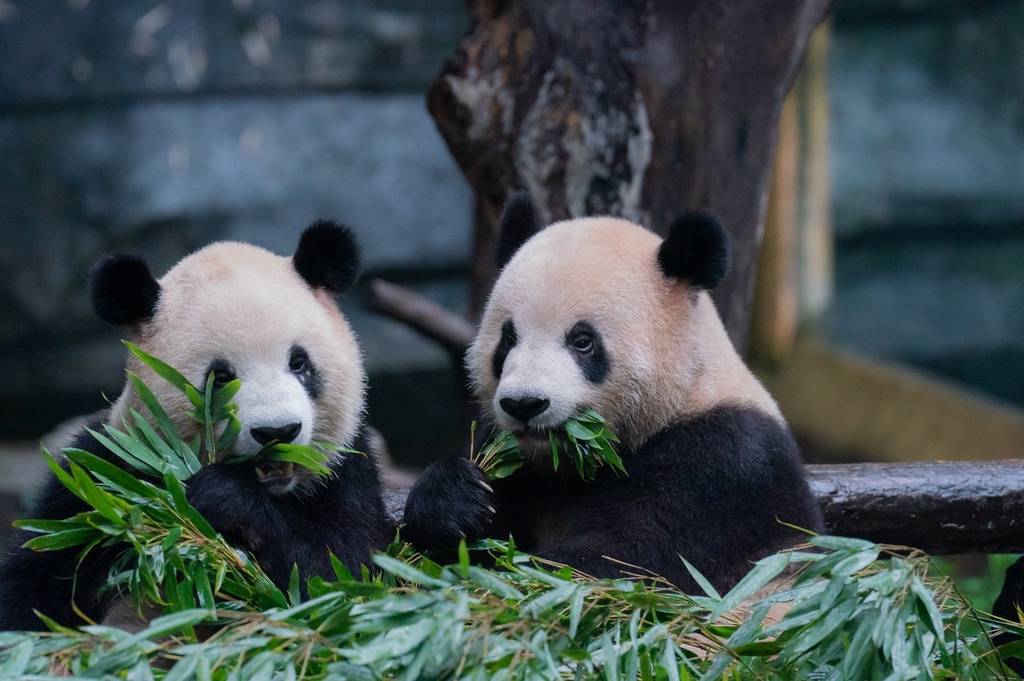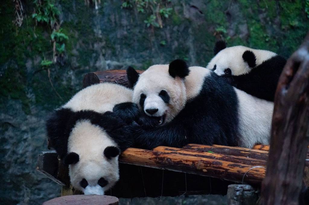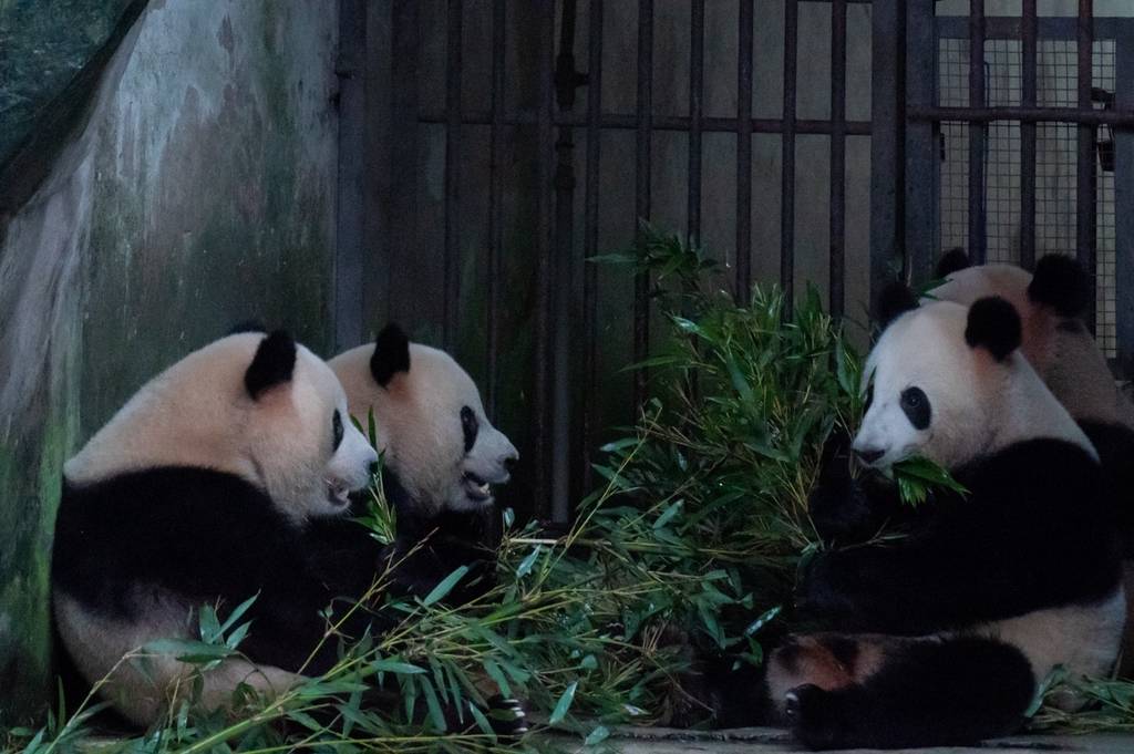 2023年9月23日,重庆动物园,“渝可”“渝爱”、大小“四喜丸子”等大熊猫雨中“围炉煮茶”吃播卖萌、嬉戏玩耍。