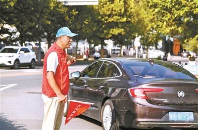 路口是展现城市文明的重要窗口,文明单位的志愿者们像一朵朵流动的文明之花,用自己的微笑、语言和行动感染着身边的路人,共同培育着首都文明交通的新风尚。