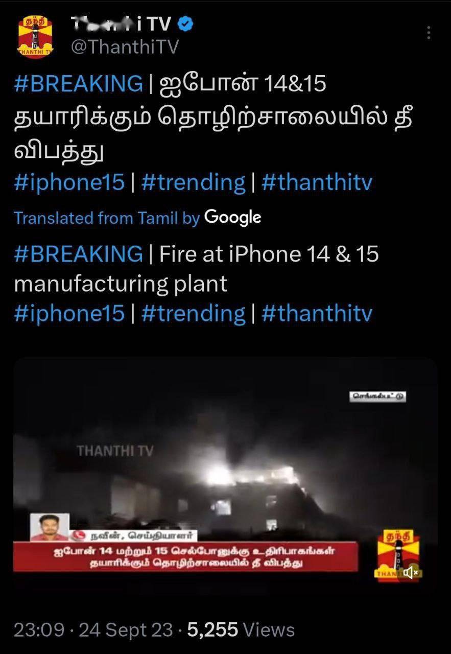 IT之家 9 月 26 日消息,和硕位于印度金奈(Chennai)的工厂于当地时间 2023 年 9 月 24 日发生火灾,导致 iPhone 组装业务暂时中止。