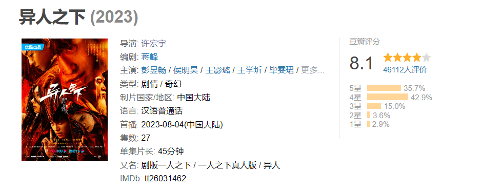 近期,漫改剧《异人之下》豆瓣评分出炉,开分8.1打破国产漫改剧开分记录。