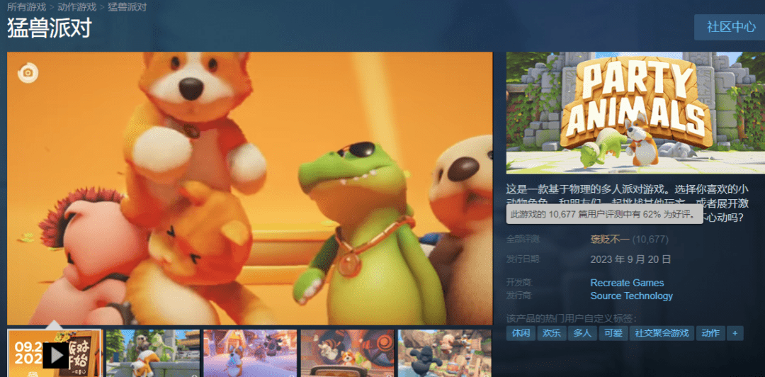 9月20日,所思科技开发的派对游戏《猛兽派对》登录Steam,国区普通版售价98元,豪华版147元。游戏发售首日同时在线玩家数量达10万,目前已有上万条测评,整体为“褒贬不一”,好评率62%。具体来看,大部分差评都在吐槽《猛兽派对》作为派对游戏定价过高。
