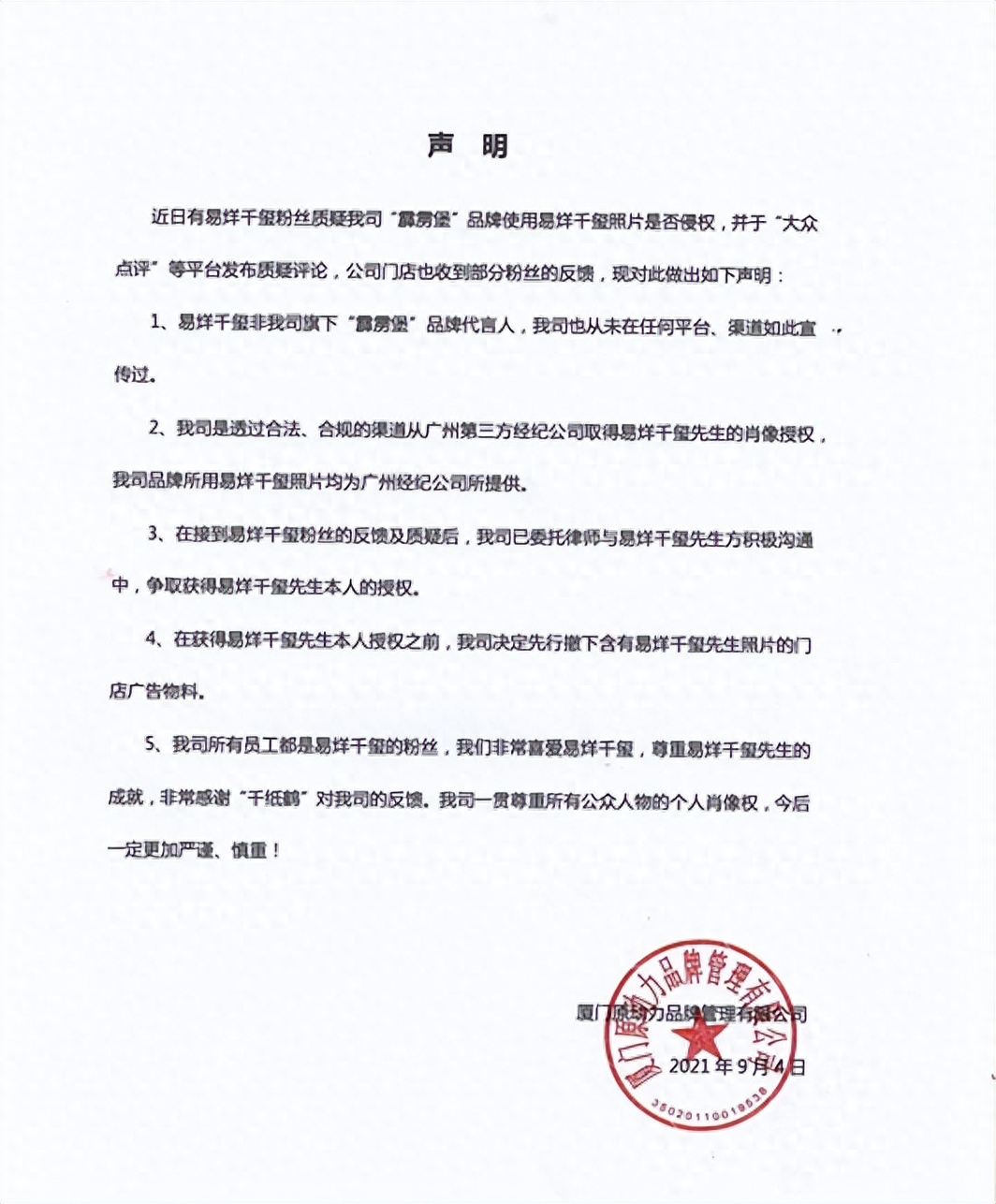 针对外界质疑,厦门原动力曾在其微信公众号中作出回应。2021年9月,该公司发布声明称,易烊千玺并非该公司旗下“霹雳堡”品牌代言人,该公司也从未在任何平台、渠道如此宣传过,并称公司是透过合法、合规的渠道从广州第三方经纪公司取得易烊千玺的肖像授权,所用易烊千玺照片均为广州经纪公司所提供。
