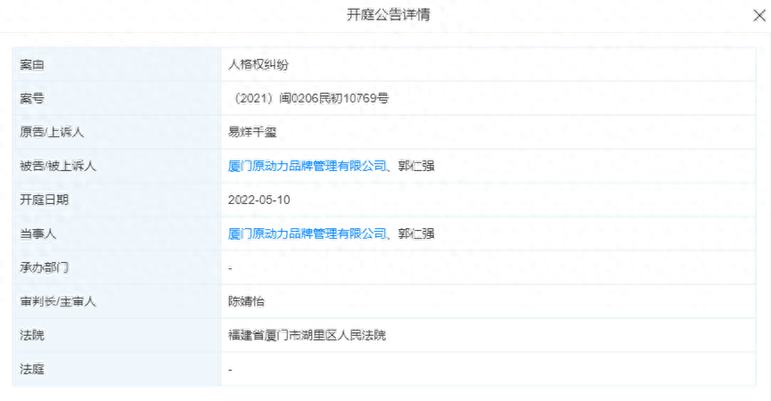 2022年5月,因人格权纠纷,易烊千玺与汉堡品牌“霹雳堡”的运营商厦门原动力品牌管理有限公司对簿公堂。天眼查App显示,易烊千玺与厦门原动力品牌管理有限公司人格权纠纷相关案件新增开庭公告,相关案件拟于5月10日在厦门市湖里区人民法院开庭。另据北京青年报10日报道,原定于当日开庭的该案因故延期。