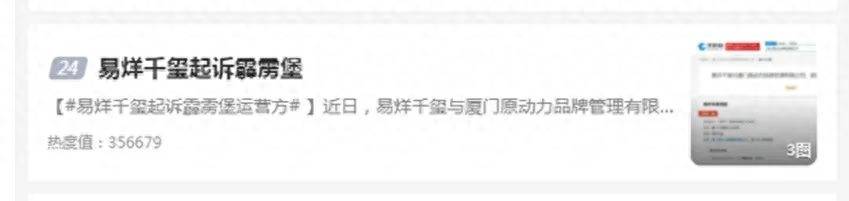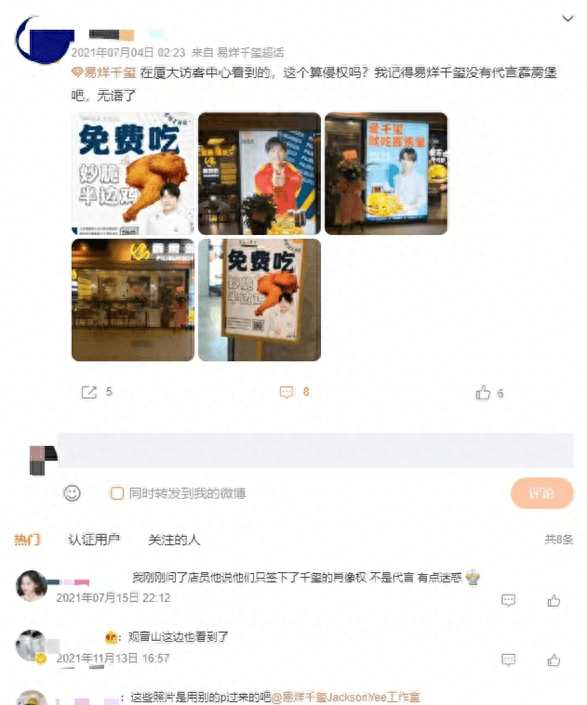 早在2021年,就有微博网友陆续发文质疑霹雳堡使用易烊千玺照片进行宣传。2021年7月,一网民在微博发文称:“我记得易烊千玺没有代言霹雳堡吧,无语了”。该微博下有评论表示:“我刚刚问了店员,他说他们只签下了千玺的肖像权,不是代言,有点迷惑。”还有评论认为该行为涉嫌侵权。天眼查知识产权信息显示,“霹雳堡 PILIBURGER”商标的注册企业为厦门原动力品牌管理有限公司(以下简称“厦门原动力”)。