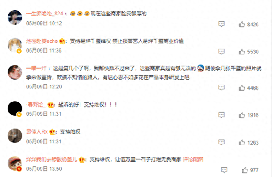 针对艺人频频被商家“碰瓷”的现象,网友普遍支持艺人拿起法律武器大胆维权,谴责不良商家无下限的“蹭热度”行为,还有不少网友怒喷商家“无耻!”。
