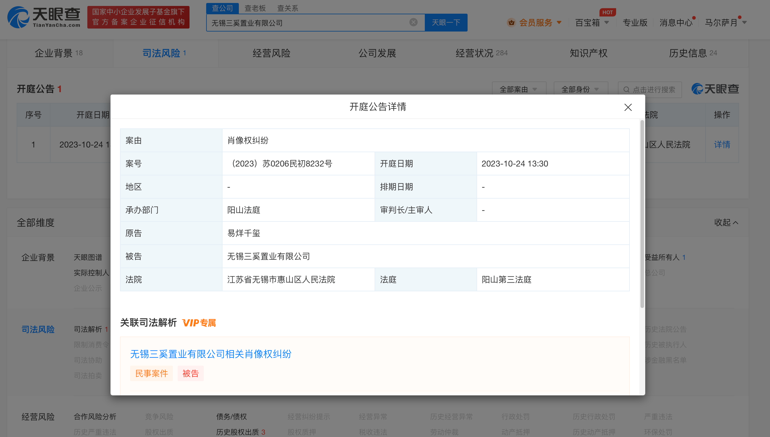 天眼查App显示,近日,无锡三奚置业有限公司新增一则开庭公告,原告为易烊千玺,案由为肖像权纠纷,该案将于10月24日在江苏省无锡市惠山区人民法院开庭审理。