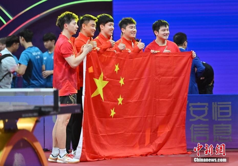 中国乒乓男队在领奖台上合影。中新社记者 骆云飞 摄