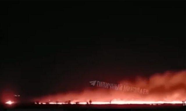 本来这是一次俄乌冲突中很常见的“导弹袭城战”,孰料还有后续。9月25日夜间,位于尼古拉耶夫州的库尔巴基诺军用机场也遭到空袭,这里被俄军怀疑是装备了苏-24的乌军第299战术航空旅部署基地,初步证实至少一架苏-24毁于空袭。有无法证实的消息称,还有一架米格-29战斗机被击毁,有当地乌克兰人拍摄到机场遇袭后,腾起几乎照亮天空的火光。