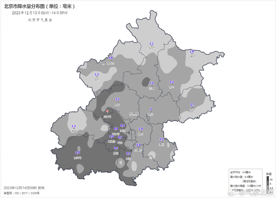 据统计,从12月13日5时至14日9时,北京地区全市平均降雪量4.0毫米,城区平均4.7毫米;最大降雪出现在海淀凤凰岭8.0毫米,最大降雪强度出现在延庆香营村13日11时至12时3.0毫米/小时。