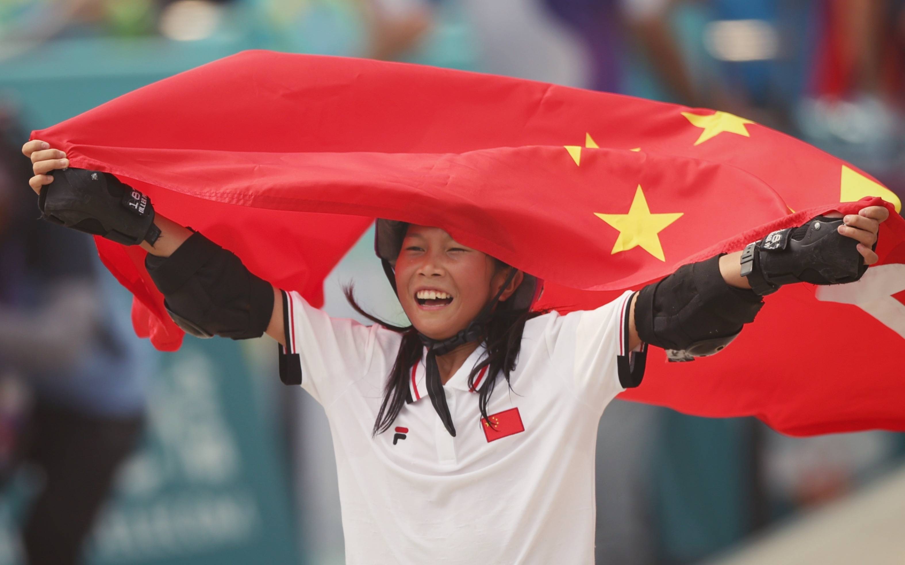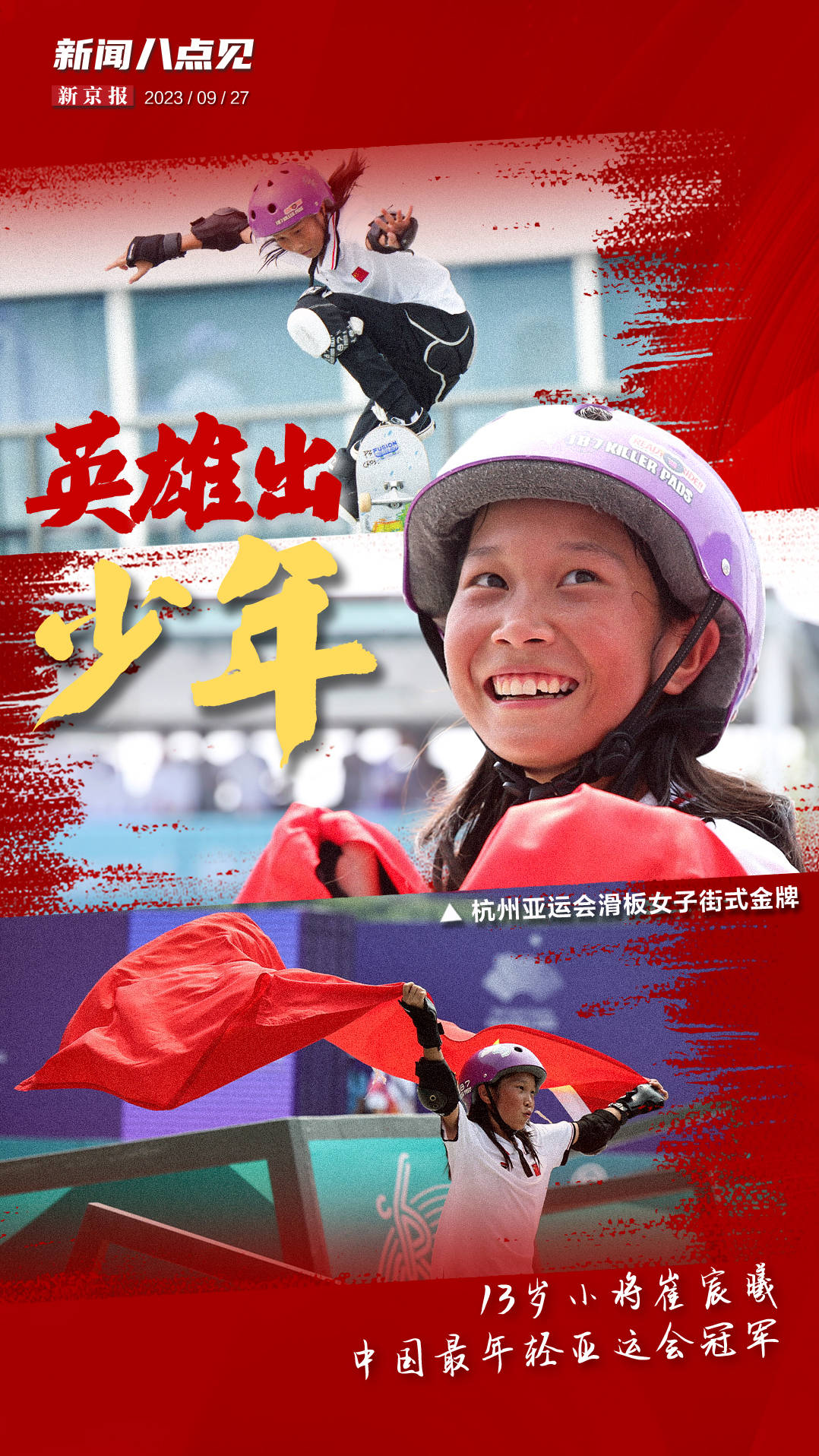9月27日的钱塘轮滑中心,杭州亚运会滑板项目女子街式决赛结束,崔宸曦、曾文蕙分获冠军、亚军。作为杭州亚运会中国代表团最年轻的选手,13岁的崔宸曦登上最高领奖台的同时,也成为中国最年轻的亚运会冠军。