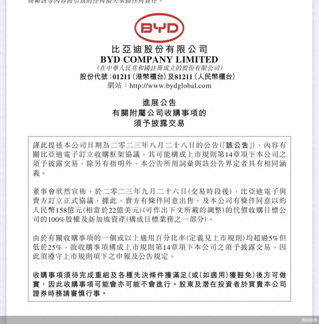 比亚迪史上最大并购敲定。9月27日,比亚迪股份有限公司发布公告显示,控股子公司比亚迪电子(国际)有限公司(以下简称“比亚迪电子”)已与Jabil Inc.(以下简称“捷普”)旗下子公司Jabil Circuit(Singapore)Pte.Ltd.(以下简称“捷普新加坡”)签署《股权收购协议》(以下简称“协议”)。